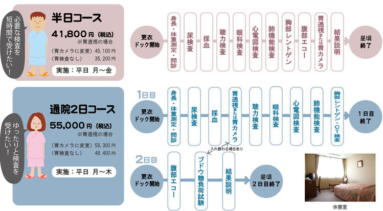 【実施】平日 月~金 【時間】午後2時~午後4時 ※半日ドックと一緒に受けることもできます |