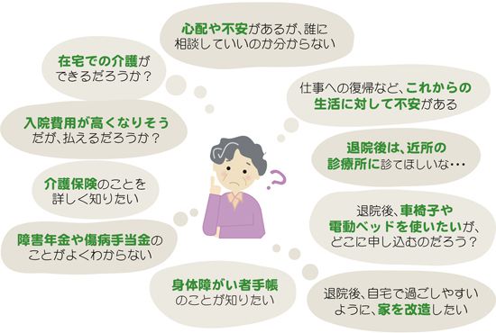 社会福祉士が、患者さんやご家族からの医療・介護・福祉に関するご相談を伺い、適切に医療を受け安心して療養に専念できるように患者さんやご家族の抱える次のような問題の解決を一緒に考えます。