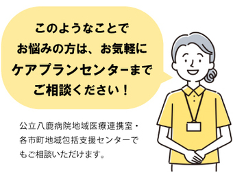 八鹿病院では、「家で療養したい」「より元気に過ごしたい」「介護を支えてほしい」などの介護保険制度利用を希望されている方のために、ケアプランを作成する機関として、ケアプランセンター(居宅介護支援事業所)を設置しています。