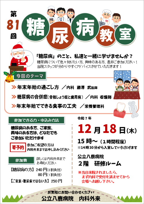 | 申込み方法 | 要予約 参加ご希望の方は内科外来までお申し込みください。 |