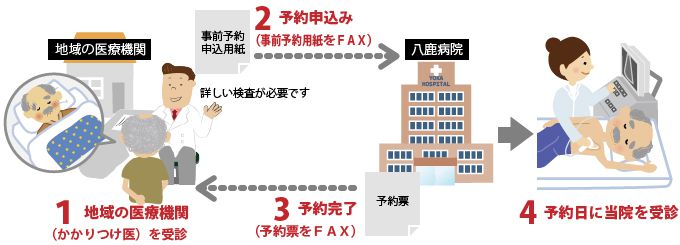 直接、地域医療連携室にお越しください。 (事前にお電話いただきますと日程調整致します) 各科外来や病室にもお伺い致しますのでスタッフにお知らせください。 |